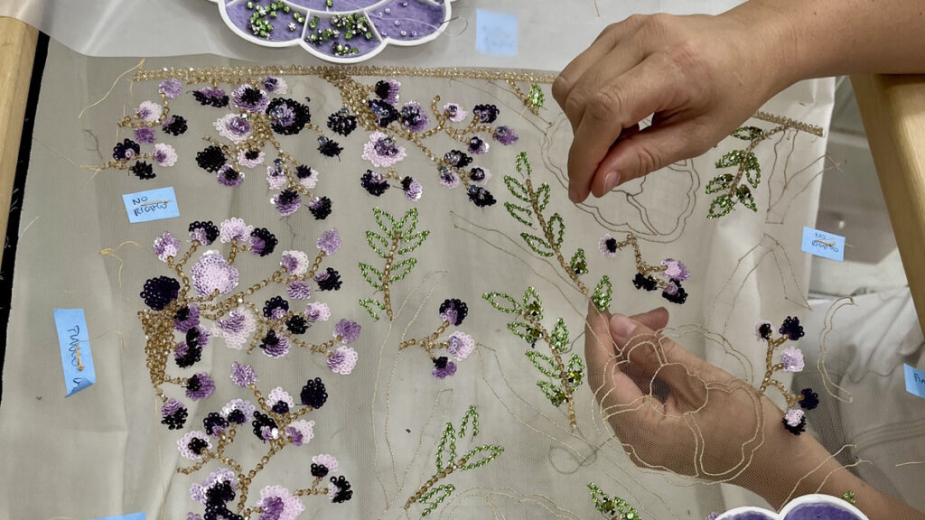 Il reparto ricamo è il cuore pulsante di Bead Studio: un’arte silenziosa, guidata da mani esperte, che trasformano il cartamodello in materia viva.